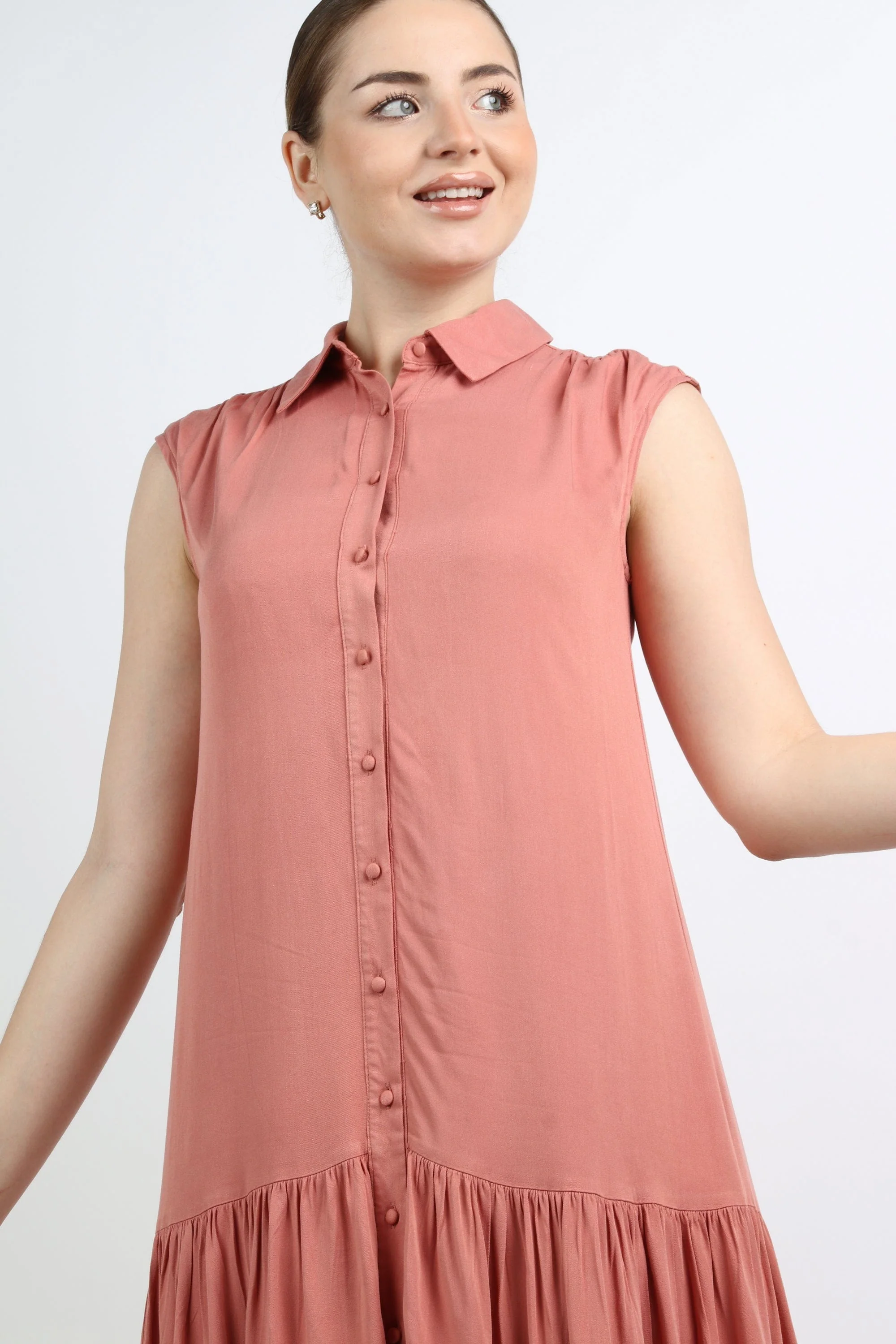 فستان طويل سادة بياقة وأزرار أمامية بدون كم