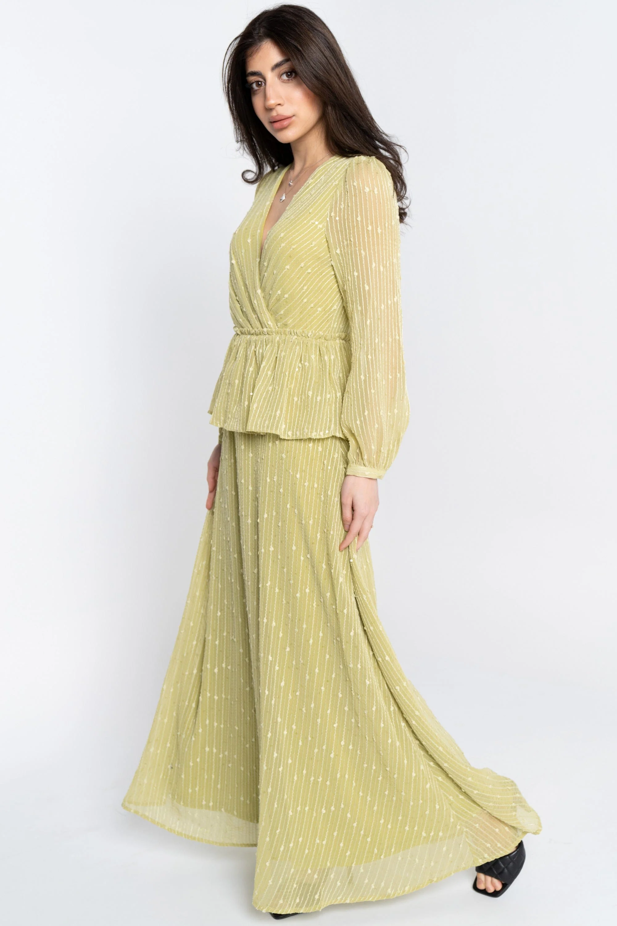 هل تبحثين عن فستان يجمع بين الأنوثة والراحة لمناسباتك الأنيقة؟ هذا الفستان الماكسي المنقوش بلون أخضر خيار رائع للخروجات الرومانسية والحفلات المسائية. مصمم بقصة A عادية تمنحك حركة هادئة وذيل يمتد بطول ماكسي، وياقة V تضيف لمسة أنثوية ونقاط كشكش تمنحه حيوية ناعمة. الخامة من بوليستر 100% خفيف ورفيع، مع معالجة داخلية بسيطة من بوليستر تجعل الفستان مريحاً للارتداء طوال اليوم بدون بطانة سميكة. الأكمام طويلة تضيف أناقة وتحمي من نسيم المساء، والفستان خالٍ من الجيوب ولا يحتوي على حزام مدمج، ما يتيح لك إضافة إكسسوار حسب ذوقك. مناسب لكل المواسم مع لمسات تنسيق بسيطة ستجعله قطعة مميزة في خزانة المرأة البالغة. اعثري على مقاسك في فاشن السعودية وأضيفي هذه القطعة المتنوعة إلى خزانة ملابسك اليوم.
