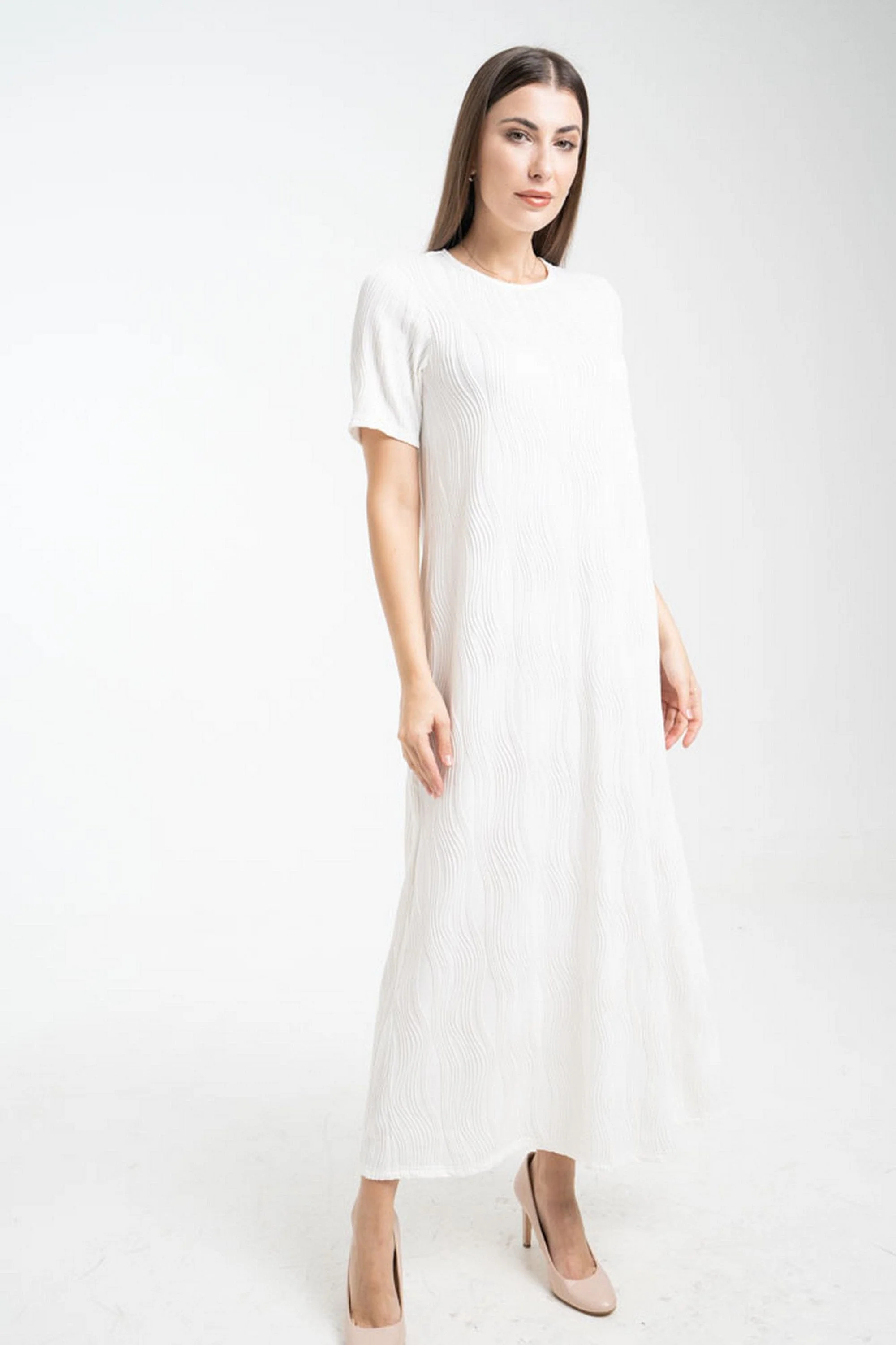 لما تبحثين عن فستان أبيض يناسب خزانة كلها مواقف بسيطة وأنيقة، هذا الفستان رائع. خامته من بوليستر 95% وإيلاستين 5% تعطيه مرونة واحتفاظاً بالشكل وراحة طوال اليوم، مع سمك متوسط مناسب لكل المواسم. تصميمه قصة مستقيمة وياقة مستديرة مع كم قصير وطول ماكسي يجعل الإطلالة هادئة وعصرية في نفس الوقت. النقشة سادة والقطعة بدون بطانة أو جيوب أو حزام، لذلك تحسي بخفة وحركة طبيعية. مثالي للخروجات الرومانسية واللقاءات الصباحية والمشاوير الكاجوال. ستحبين كيف يتحرك معك ويمنحك إطلالة نظيفة وسهلة التنسيق سواء مع صندل مسطح أو سنيكرز أو جاكيت خفيف للمساء. اعثري على مقاسك في فاشن السعودية وأضيفي هذه القطعة المتنوعة إلى خزانة ملابسك اليوم.
