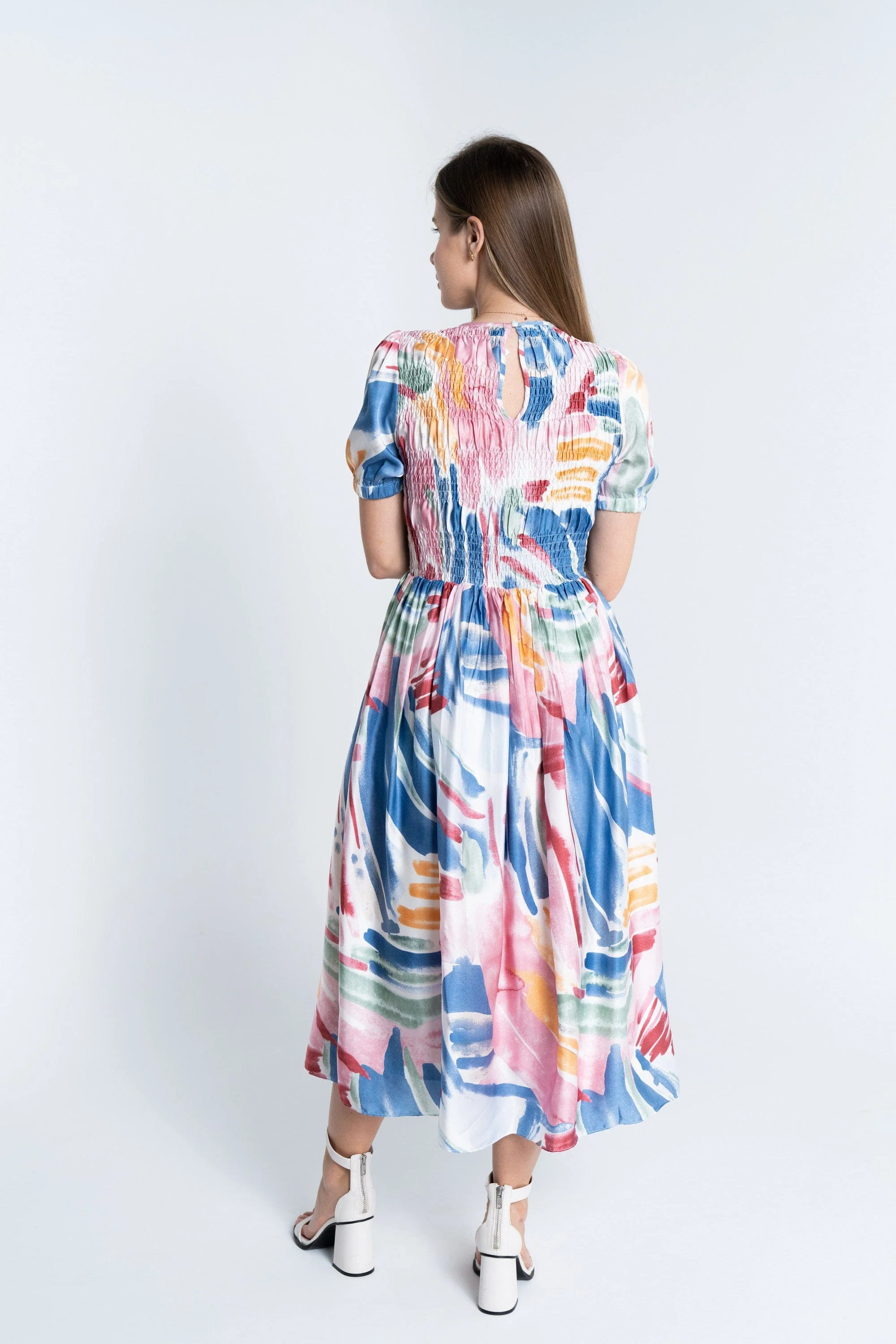 - العناية: غسلي الفستان بماء بارد على دورة لطيفة مع ألوان مشابهة، تجنبي المبيضات، ينصح بكوي منخفض الحرارة إذا لزم الأمر وتجفيفه مسطحاً أو على درجة حرارة منخفضة في النش.