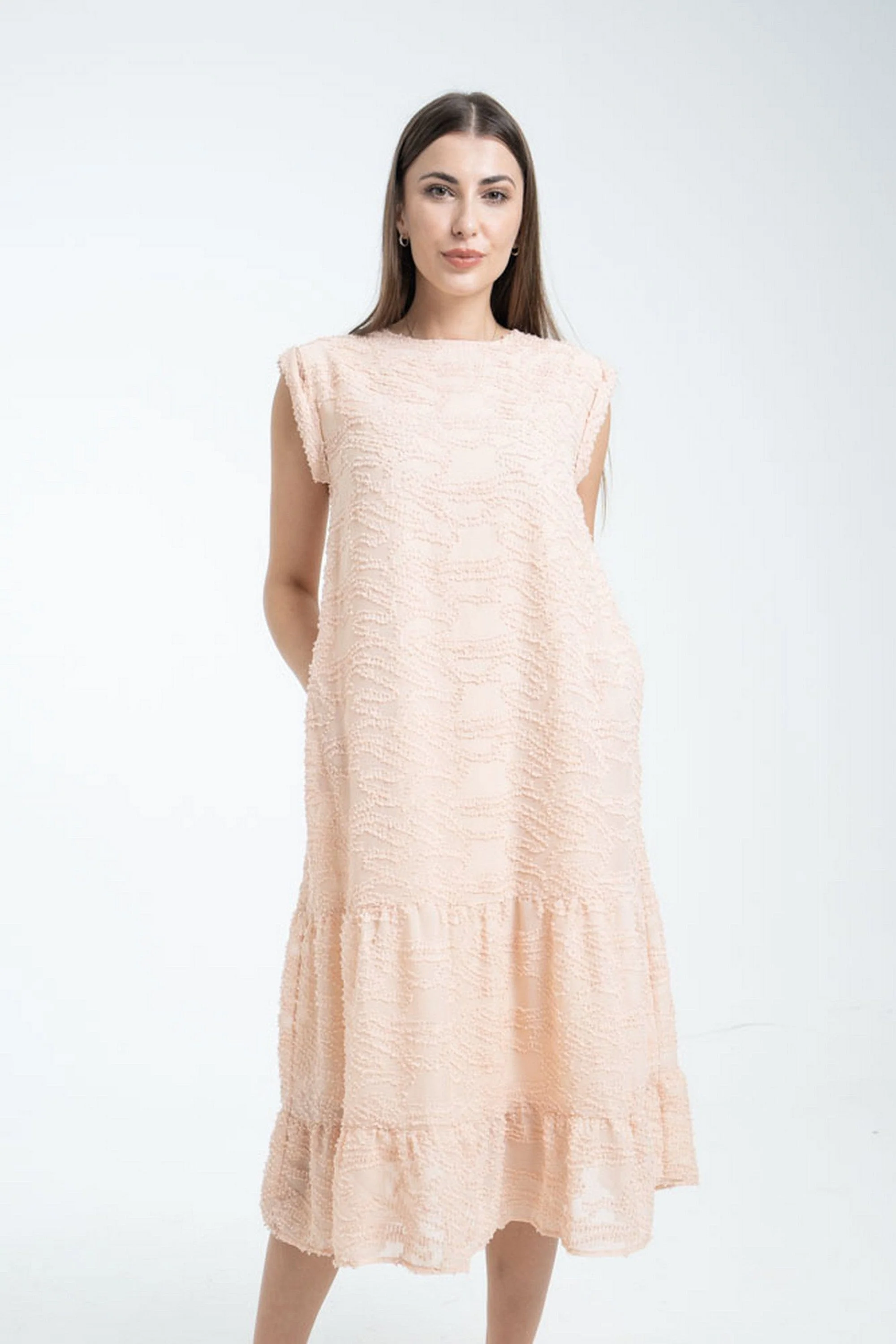 أحيانًا تريدين فستانًا يبدو أنيقًا وفي نفس الوقت عملي للحياة اليومية — هذا الفستان رائع لهذا الدور. خامته 55% قطن و45% نايلون تمنح ملمسًا ناعمًا مع متانة خفيفة، وتوجد لمسات مبطنة ومطرزة بارزة لإضفاء شخصية على التصميم. البطانة مذكورة 100% بوليستر لكن التصميم النهائي يأتي بدون بطانة منفصلة ليبقى أخف ومناسبًا للطبقات. بقصة A ميدي وياقة مستديرة وبلا أكمام، يأتي بقصة عادية وسماكة متوسطة تمنحك راحة الحركة. لونه الخوخي يضيف دفء للنهار والليل، والقطع بدون جيوب وبدون حزام تحافظ على سطر نظيف. مثالي للخروجات الكاجوال والرومانسية، ستحبين كيف يتحرك معك ويناسب خزانة كل المواسم. اعثري على مقاسك في فاشن السعودية وأضيفي هذه القطعة المتنوعة إلى خزانة ملابسك اليوم.
