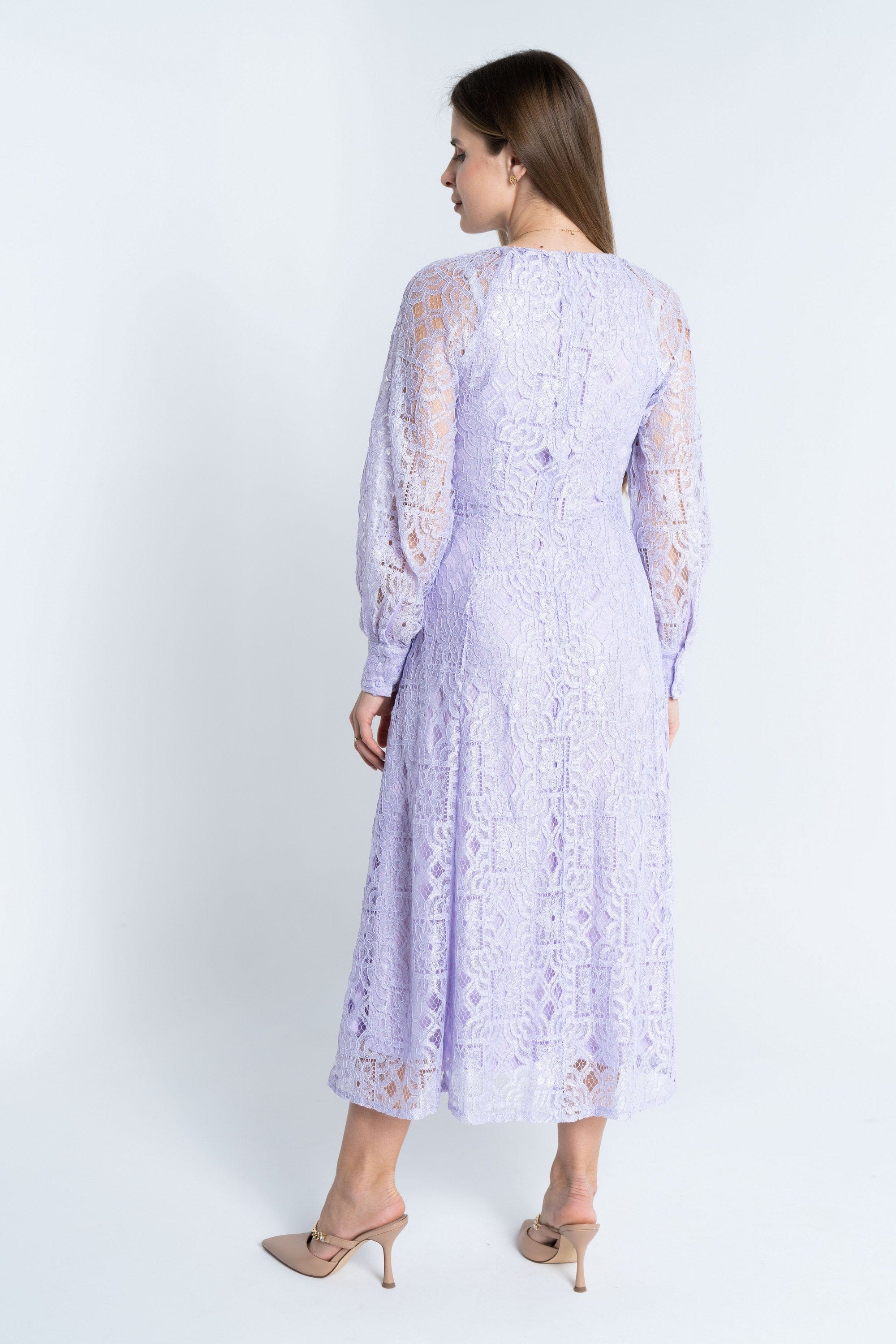 لما تبحثين عن فستان يبرز أنوثتك من غير تعقيد، هذا الفستان الميدي هو خيار عملي وجميل. قماش رئيسي بوليستر 100% مع وجود بطانة بوليستر 100% في أجزاء محددة، ما يمنحه متانة وشعور مريح بسمك متوسط مناسب لكل المواسم. قصة A تمنح انسيابًا أنثويًا وقصة عادية مريحة، وياقة مستديرة تكمل ملامح الرقبة بطريقة ناعمة. الأكمام طويلة تضيف لمسة احتشام، والنقشة المطرزة البارزة مع دانتيل مشغول تضفي نقوشًا مرئية تضيف طابع أنثوي مميز. الفستان يأتي بدون جيوب وبدون حزام، ويتميز بتفاصيل مفتوحة أنثوية تضيف حركة للقطعة. مثالي للخروجات الكاجوال والمناسبات اليومية؛ ستحبين كيف يتحرك معك ويمنحك مظهر ليلكي رقيق. اعثري على مقاسك في فاشن السعودية وأضيفي هذه القطعة المتنوعة إلى خزانة ملابسك اليوم.