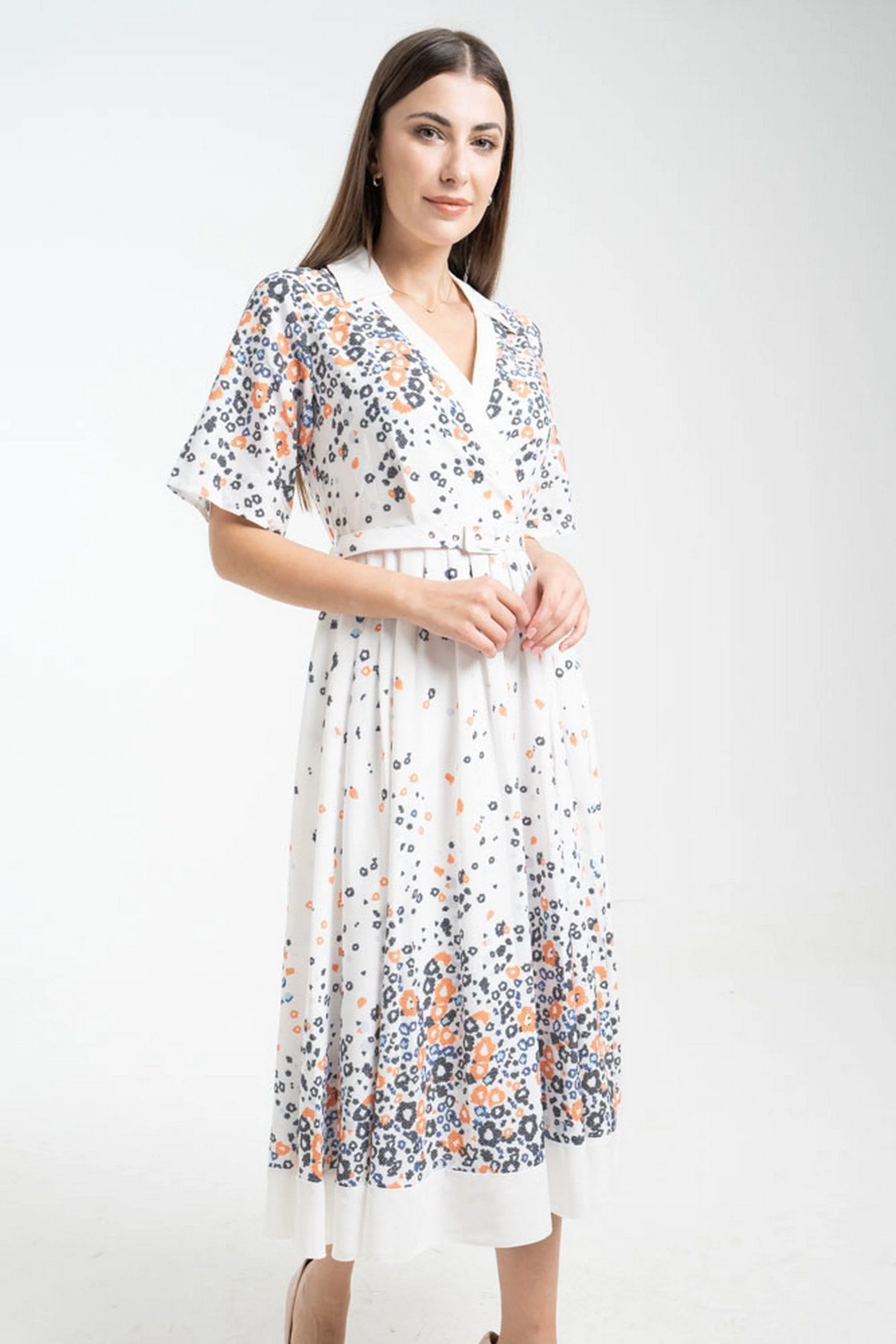 فستان ميدي بنقشة ورود لف وياقة نص كم
