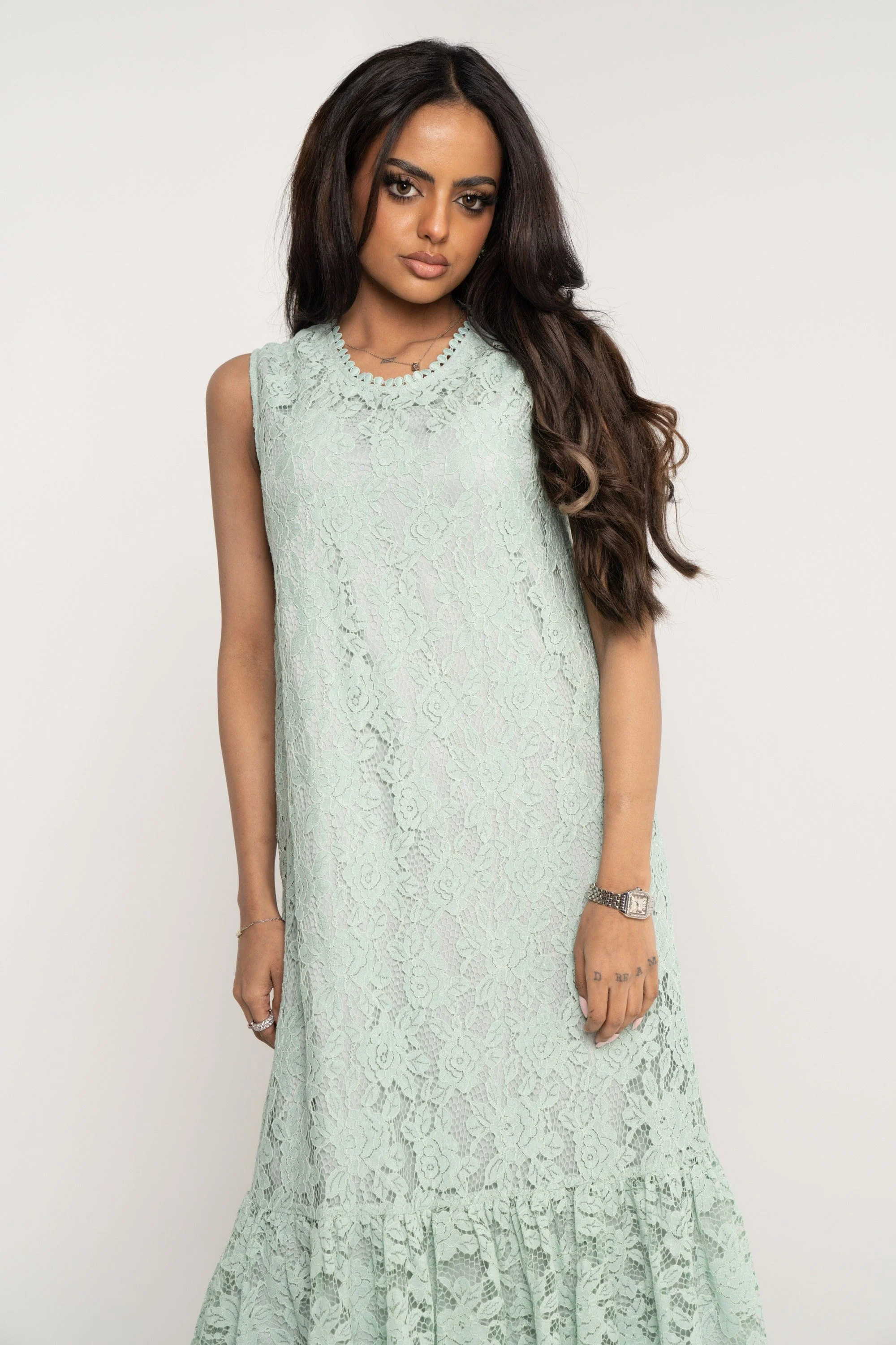 - العناية: اغسلي الفستان بماء بارد على دورة خفيفة واقلبي القطعة قبل الغسيل لحماية الدانتيل والنقشة. لا تستخدمي مبيضات، جففيه معلّقًا بعيدًا عن الشمس المباشرة، وامسحيه أو اكويه بحرارة منخفضة عند الحاجة.