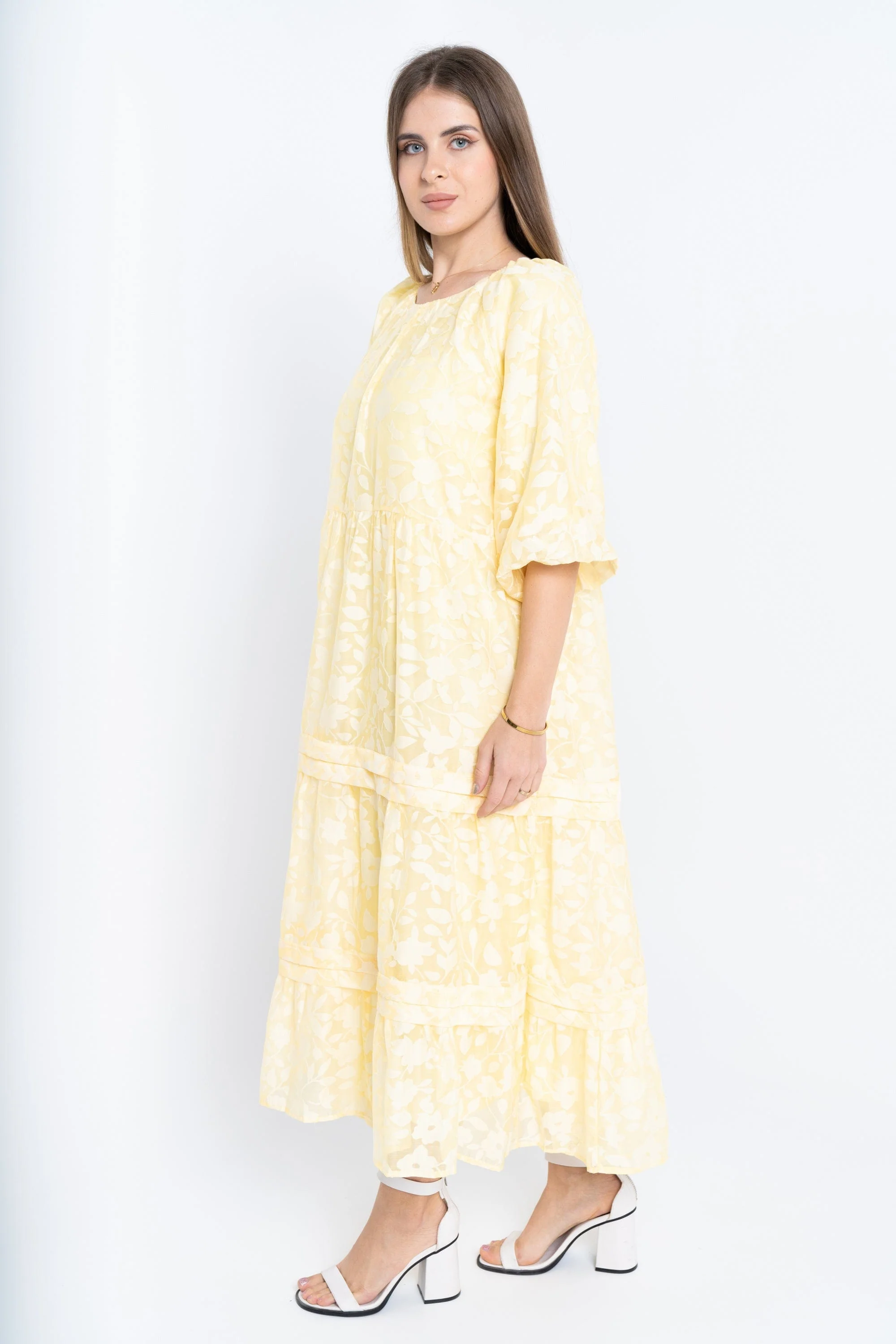 إذا كنتِ تبحثين عن فستان صيفي مريح وعصري، هذا الفستان الأصفر بقصة A ماكسي سيجذبك فوراً. خامته من بوليستر 100% تمنحه متانة وسهولة في العناية، والبطانة أيضاً من بوليستر تضيف نعومة عند الارتداء. ياقة مستديرة وأكمام كم ثلاثة أرباع تمنحانك لمسة كلاسيكية ومُريحة، بينما نقشة الزهور الصفراء تجعله مثالي للخروجات النهارية أو لموعد رومانسي. الطول الماكسي يجعله مناسباً للنزهات والمشاوير الصيفية، وستحبين كيف يتحرك معك عند المشي. خفيف بسمك متوسط ويمنح مظهراً أنيقاً دون تعقيد، مناسب لخزانة ملابسك الصيفية ومناسب للمظهر الكاجوال العصري. اعثري على مقاسك في فاشن السعودية وأضيفي هذه القطعة المتنوعة إلى خزانة ملابسك اليوم.