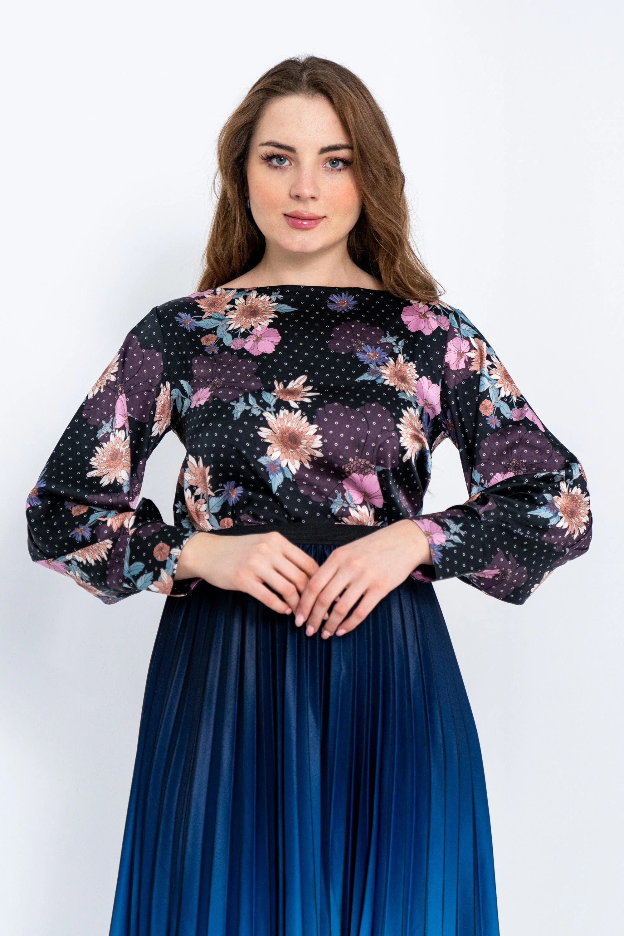 بلوزة ستان موردة كم طويل واسع نسائي