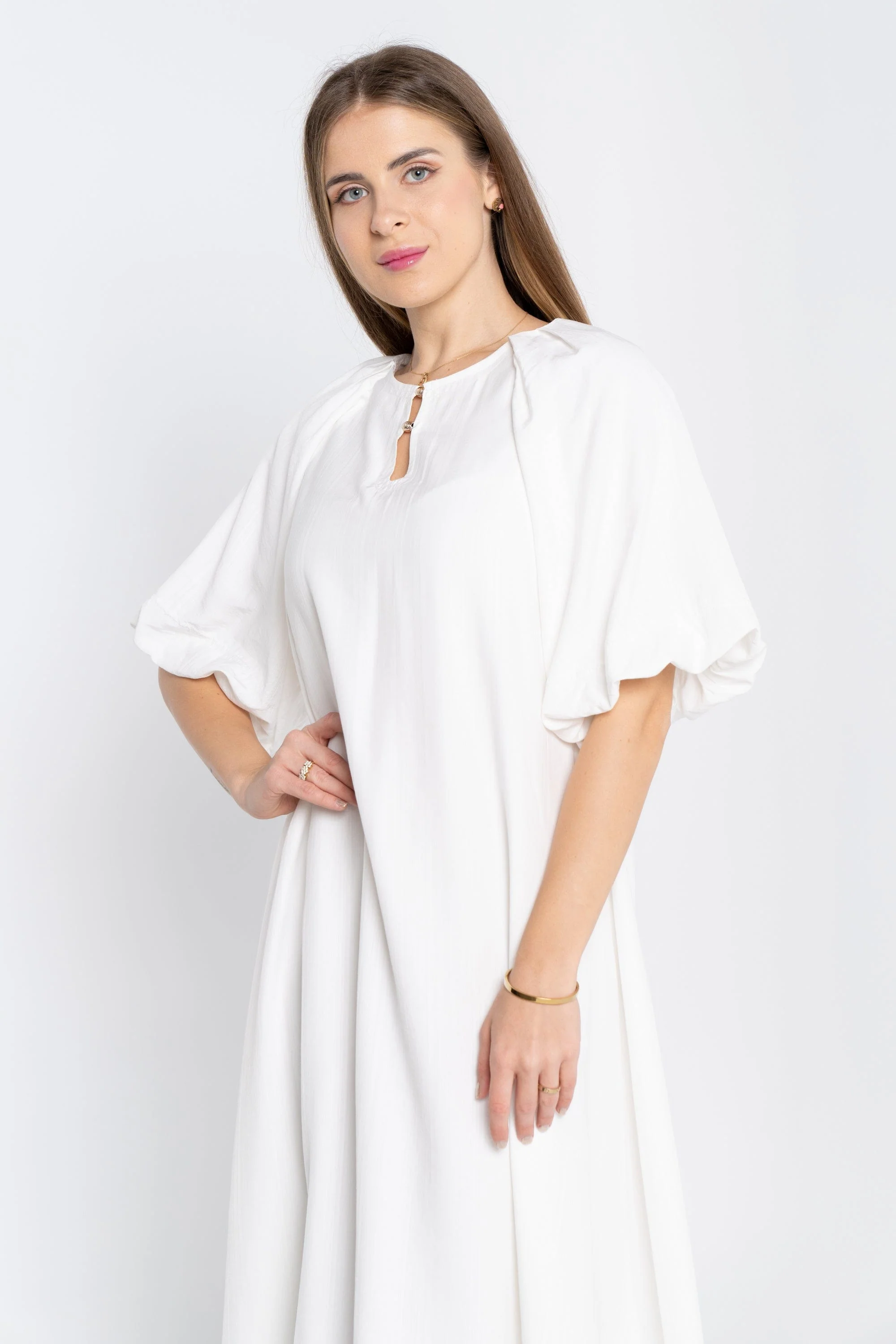 لو تبحثين عن فستان أبيض مريح وعصري تضيفينه لخزانة يومية، هذا الفستان مثالي. الخامة مزيج 66% فيسكوز و34% بوليستر، ملمسها ناعم مع سماكة متوسطة تناسب كل المواسم وتساعده يحافظ على شكله بعد الغسيل. قصته A بطول ميدي تمنح حركة جميلة وستحبين كيف يتحرك معك عند المشي. ياقة مستديرة تمنح طابع بسيط وأنيق، والأكمام المنفوخة القصيرة تضيف لمسة أنثوية مرحة. لونه سادة أبيض يسهل تنسيقه. لا يحتوي على جيوب أو بطانة أو حزام، ما يجعله خفيف وقابل للارتداء بالكثير من الأساليب. مناسب للخروجات الكاجوال، لقاءات القهوة والنزهات، ويمكنك ارتداؤه في أيام العمل الخفيفة أو عطلات نهاية الأسبوع. اعثري على مقاسك في فاشن السعودية وأضيفي هذه القطعة المتنوعة إلى خزانة ملابسك اليوم.